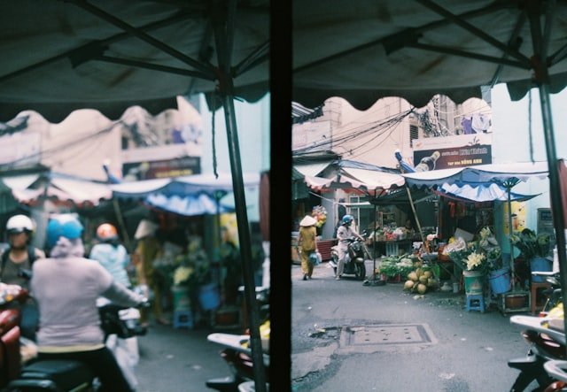 A group of people standing around a market